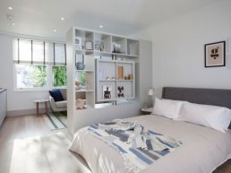 Спальня в скандинавском стиле станет излюбленным местом для отдыха, восстановления сил, релаксации и создания интимной обстановки. Мы помним, что скандинавы любят свет, поэтому на окна не стоит вешать плотные шторы, а подоконник заставлять лишними вещами. Ничто не должно мешать солнцу озарять вашу спальню. Избегайте перегруженности: в правильно сконструированные маленькие шкафы поместится больше вещей, чем в огромные серванты.