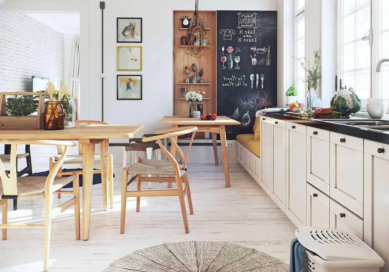 Если в новостройках кухни большие, то в старых квартирах они редко превышают и 8-10 «квадратов». А это в свою очередь создает некоторые сложности при создании интерьера. И вот здесь на помощь приходит именно скандинавский стиль, который прекрасно вписывается в маленькие пространства. Любой пастельный оттенок сделает помещение более светлым и широким, визуально добавит немного «воздуха». Считаете светлую кухню менее практичной? Этот избитый стереотип уже был много раз развеян. Плюс, на помощь приходят современные средства для уборки. Кстати, на темной поверхности загрязнения видны еще больше, чем на светлой.